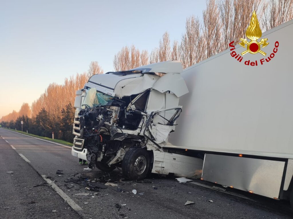 Secondo una prima ricostruzione, il furgone, che viaggiava in direzione Chioggia, avrebbe improvvisamente invaso la corsia opposta, finendo contro il mezzo pesante. L’impatto è stato violentissimo: entrambi i veicoli hanno subito gravi danni, con la parte anteriore completamente distrutta. Il camion si è fermato pericolosamente al bordo del fossato che costeggia la carreggiata. Coinvolta, seppur in modo meno rilevante, anche un’automobile che seguiva il furgone.