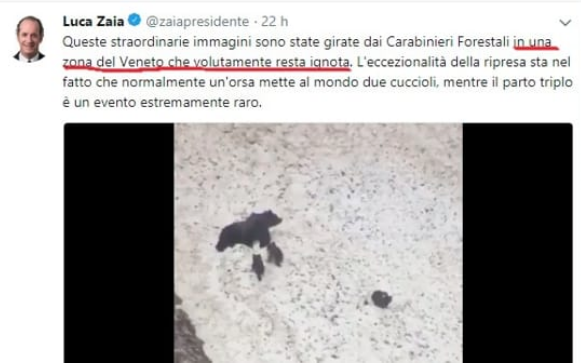 Un’orsa con tre cuccioli sulle montagne del Veneto: un evento raro, perchè i cuccioli sono quasi sempre due, e significativo, perchè sulle montagne venete. E invece no. E’ una fake news quella che il profilo twitter del governatore Zaia riporta: in primo luogo perchè non è così raro che un’orsa partorisca tre cuccioli, ma soprattutto perchè la scena è stata ripresa nel Gruppo delle Dolomiti di Brenta, in Trentino. Pochi giorni fa, infatti la Provincia autonoma di Trento ha diffuso un comunicato dove si dava notizia del raro avvistamento di un’orsa con ben 4 cuccioli. Il video dell’orsa con tre cuccioli ritwittato da Zaia o da chi gli gestisce il profilo, si riferisce al medesimo avvistamento, solo che uno dei cuccioli non compare. Il video postato dal governatore è stato condiviso ben 2893 volte ed ha ottenuto 7504 “mi piace” ma è il WWF del Trentino che ha provveduto a fare chiarezza. Nella fake news sono caduti, a cascata, anche alcuni importanti siti web d’informazione, tra cui Repubblica e il Corriere della Sera, e molti siti locali di informazione veneta. Il Settore Grandi Carnivori del Servizio Foreste e Fauna della Provincia di Trento, tramite i quotidiani trentini locali di oggi, conferma: “Quelle immagini sono state girate sul Brenta Meridionale, fanno parte dello stesso avvistamento riportato, con foto, nel comunicato. Non sappiamo come siano state diffuse in rete quindi non si sa da dove sia stata originata la bufala. Abbiamo avvertito i nostri colleghi veneti”.