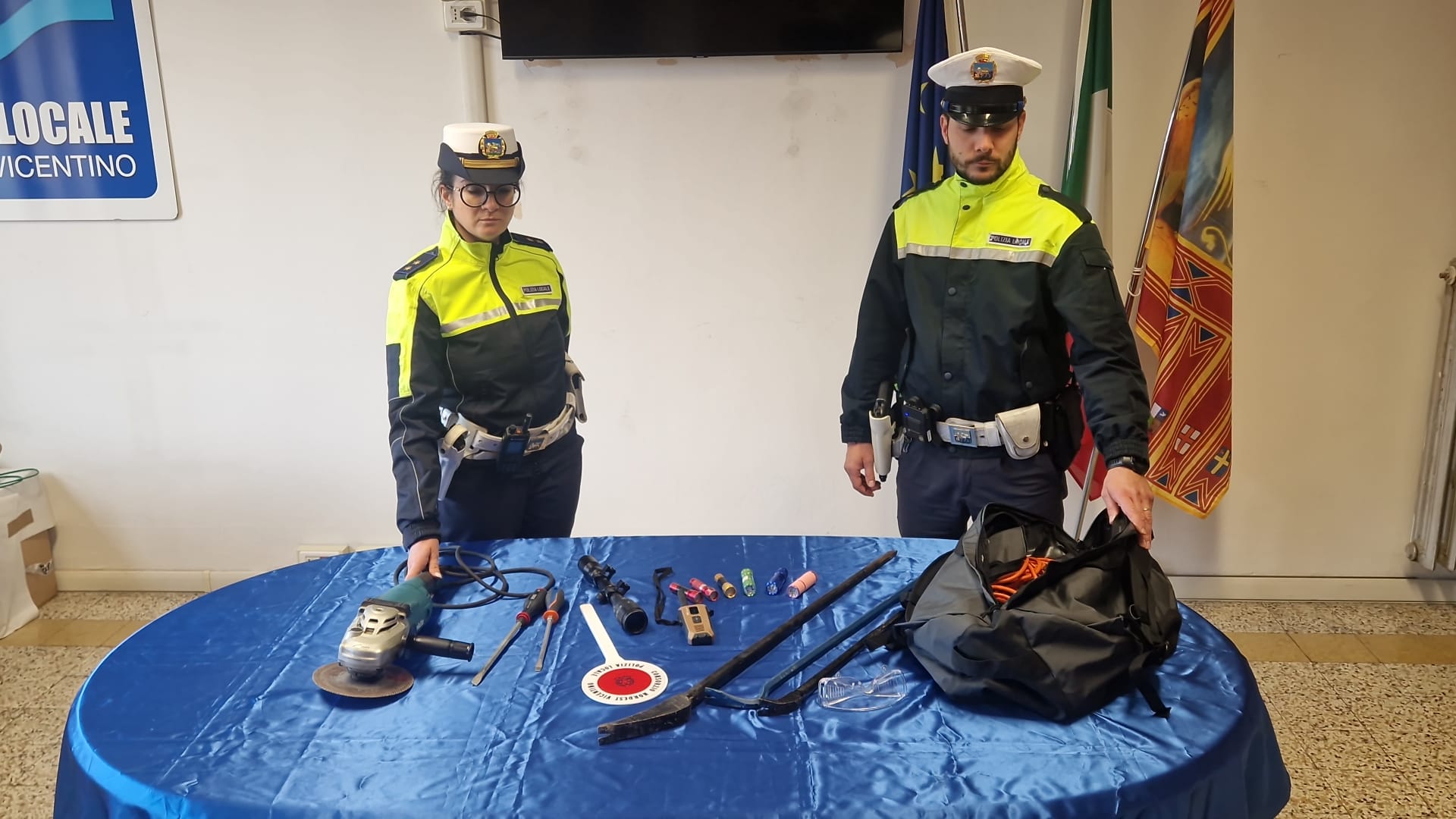 All’interno dell’autovettura, che veniva sequestrata ai sensi dell’art. 93 C.d.S., gli Agenti rinvenivano un borsone contenente: n. 1 flessibile industriale marca MAKITA; n. 1 cavo elettrico; n. 1 radio walkie tokie; n. 1 cannocchiale; n. 3 paia di guanti; n. 4 torce led con batterie; n. 2 grossi cacciaviti; n. 1 paio di occhiali protettivi da lavoro; n. 1 piede di porco; n. 2 levarini.