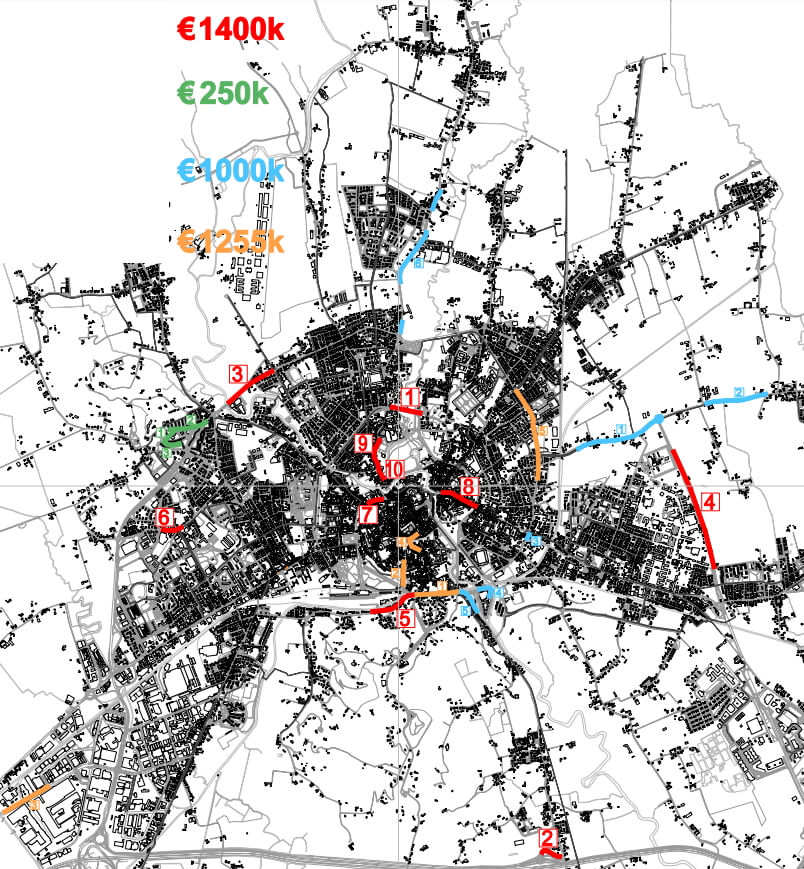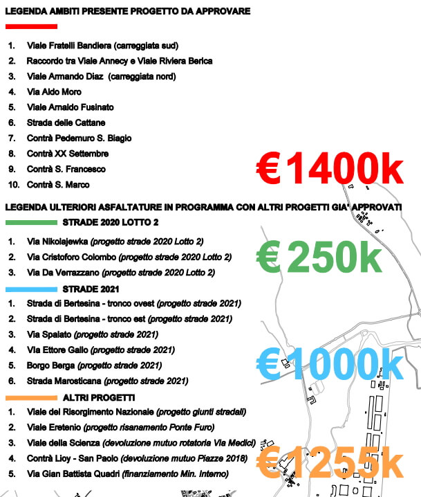 Sono dieci le strade elencate nel piano: viale Fratelli Bandiera, il raccordo tra viale Annecy e viale Riviera Berica, viale Armando Diaz, viale Aldo Moro, viale Fusinato, contra’ Pedemuro San Biagio, contra’ XX Settembre, contra’ San Marco, contra’ San Francesco, strada delle Cattane.