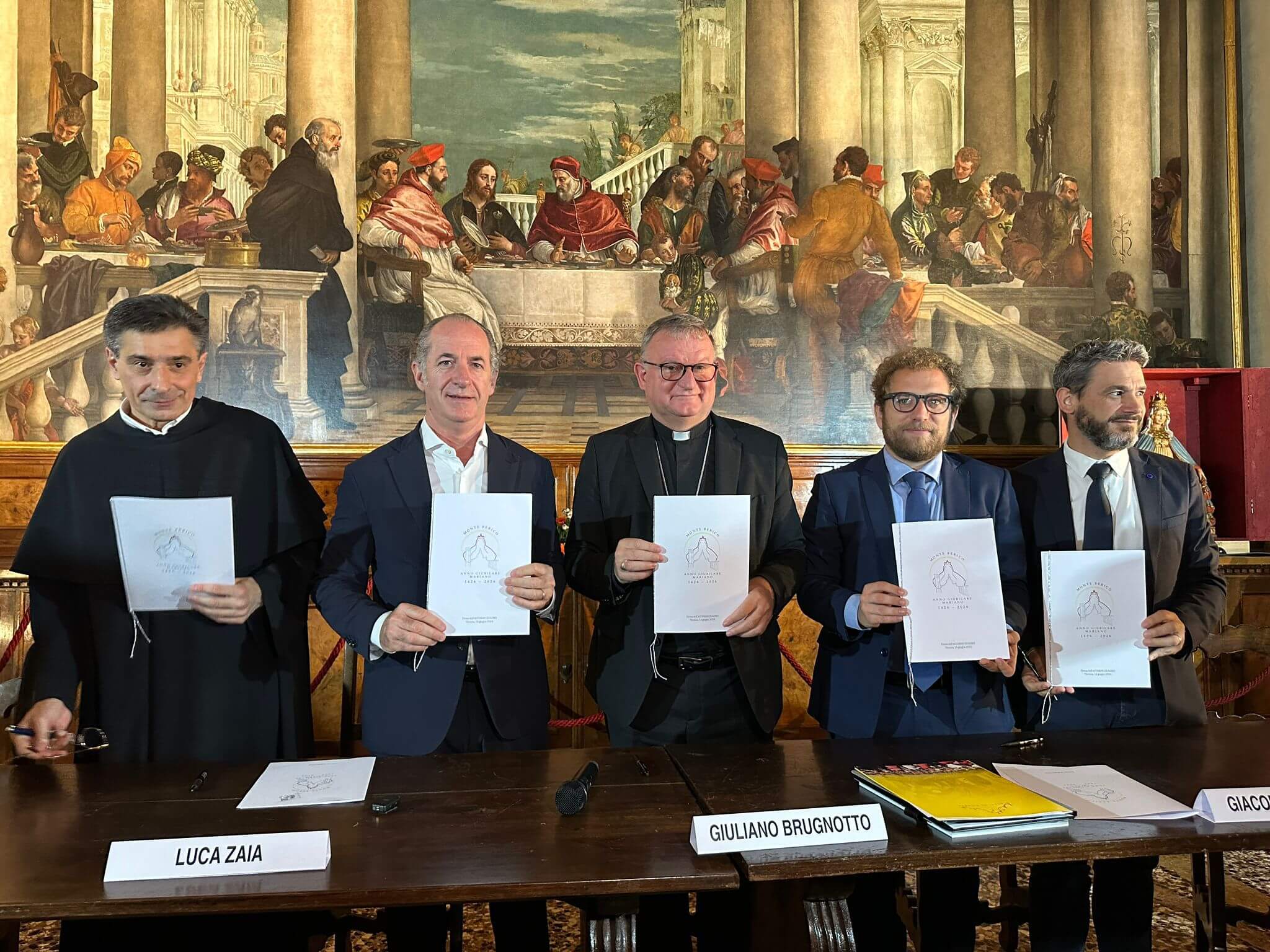 Il priore di Monte Berico padre Carlo Rossato, il vescovo di Vicenza Monsignor Giuliano Brugnotto, il presidente della Regione del Veneto Luca Zaia, il presidente della Provincia di Vicenza Andrea Nardin e il sindaco del Comune di Vicenza Giacomo Possamai hanno firmato oggi, nella sala del Refettorio del Santuario Santa Maria di Monte Berico, l’Accordo Quadro per l’ “Anno Giubilare Mariano e della Rinascita” che si celebra nel 2026.