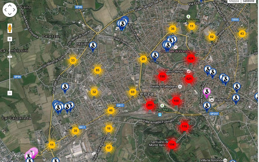 Dal programma di rilevazione risulta che le zone più controllate nella lotta al degrado urbano sono ad oggi quelle di piazza Matteotti, dei parcheggi dell’ospedale, del santuario di Monte Berico, di viale Roma, di piazza Araceli e di viale Milano.
