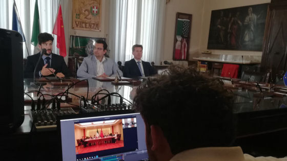 Video conferenza questa mattina alle 9 in sala giunta tra il sindaco di Vicenza Francesco Rucco ed il suo collega Chen Yan, primo cittadino della città cinese di Guiyang che nel periodo della quarantena si era distinta per un’importante donazione di materiale sanitario come mascherine, guanti e camici, fatto recapitare a palazzo Trissino.