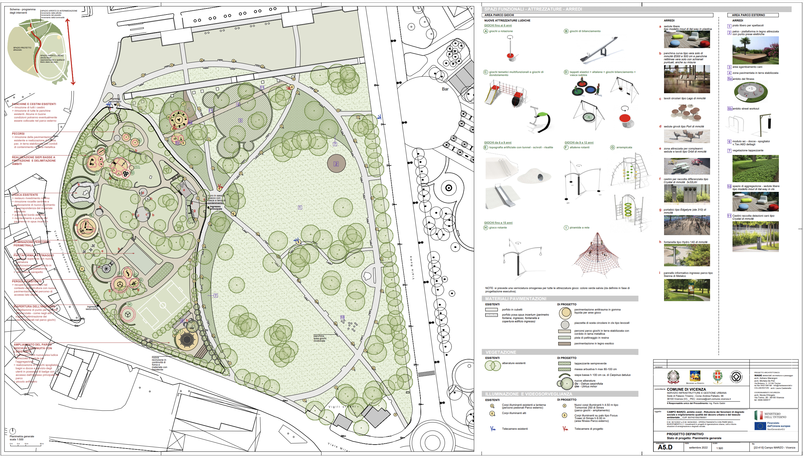 È prevista la definizione, attraverso il layout della pavimentazione antitrauma, di aree con nuove attrezzature ludiche e destinate alla sosta. Il parco giochi presenta due vocazioni distinte che hanno suggerito il layout complessivo: l’ambito destinato alle attività ludiche si sviluppa lungo il perimetro esterno in una fascia che già naturalmente risulta maggiormente rumorosa per la prossimità delle vie di traffico esterne. Per garantire una certa protezione, si è comunque ritenuto opportuno mantenere una sorta di filtro lungo il lato in affaccio alla strada, costituito da quinte semicircolari di siepi di Carpinus betulus che abbracciano gli ambiti destinati al gioco. Il nucleo più interno del parco, caratterizzato da grandi alberi, zone ombrose e spazi destinati alla sosta ha, invece, una vocazione meno chiassosa ed è stato volutamente mantenuto libero da attrezzature ludiche per favorire una fruizione destinata alla sosta, alla lettura, al dialogo e al libero stare.