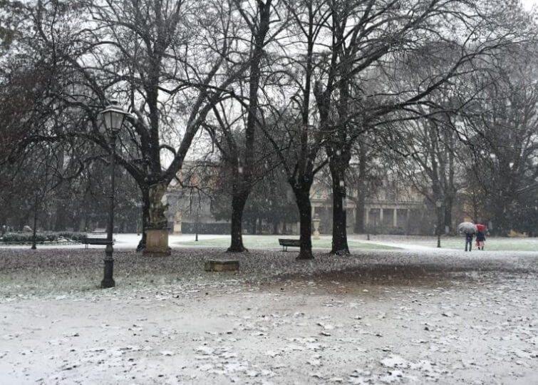 La nevicata che questa mattina ha imbiancato la città, è cessata nel primo pomeriggio, trasformandosi in pioggia e lasciando modesti accumuli al suolo.