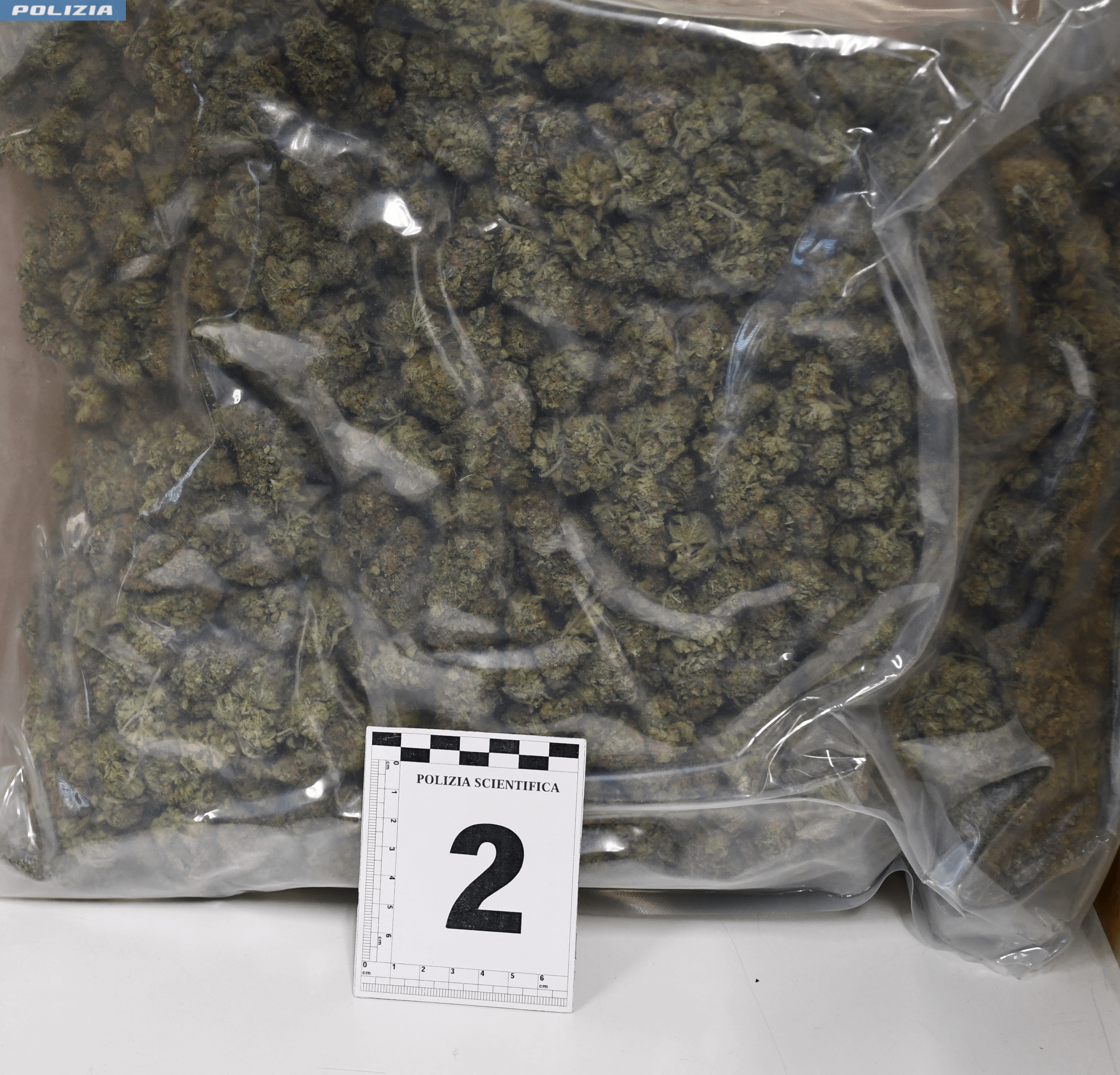 Nel frangente, uno degli Agenti, recuperava il monopattino abbandonato dal fuggitivo ed a bordo dello stesso si poneva all’inseguimento dell’uomo, riuscendo a fermarlo dopo alcune centinaia di metri. Una volta raggiuto, il fuggitivo opponeva resistenza al controllo, spingendo a terra l’Agente della Polizia di Stato (che l’aveva seguito a bordo del monopattino), rovinando entrambi a terra. Nell’immediatezza sopraggiungeva l’altro componente della pattuglia ed insieme riuscivano a bloccavano in sicurezza. L’immediato controllo della busta che portava al seguito consentita di accertare la presenza, al suo interno, di sostanza stupefacente del tipo marijuana per peso complessivo di 2.188,36 grammi, nonché circa 250 Euro in contanti.