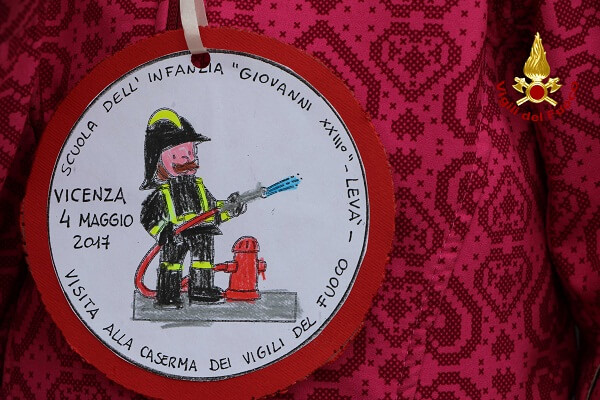 Una bandiera italiana composta con la schiuma è stato il saluto dei pompieri vicentini a conclusione della dimostrazione pratica. Successivamente i bambini accompagnati dalle maestre hanno avuto modo di visitare la sede, poter salire sui camion rossi e indossare l’elmetto dei pompieri.