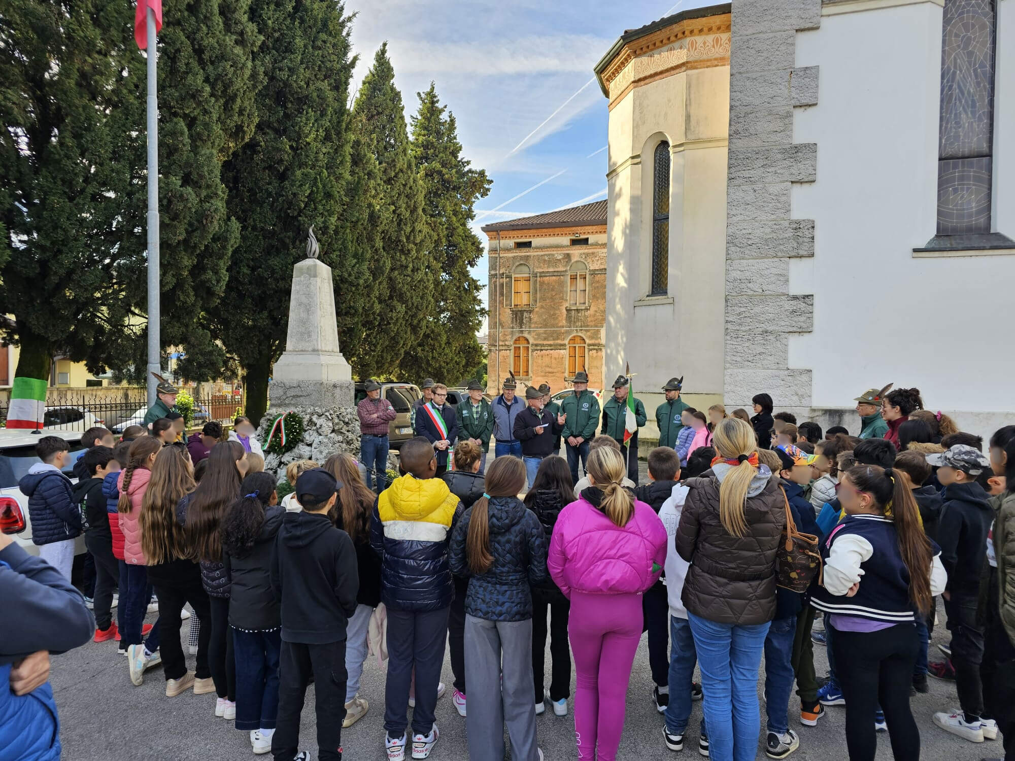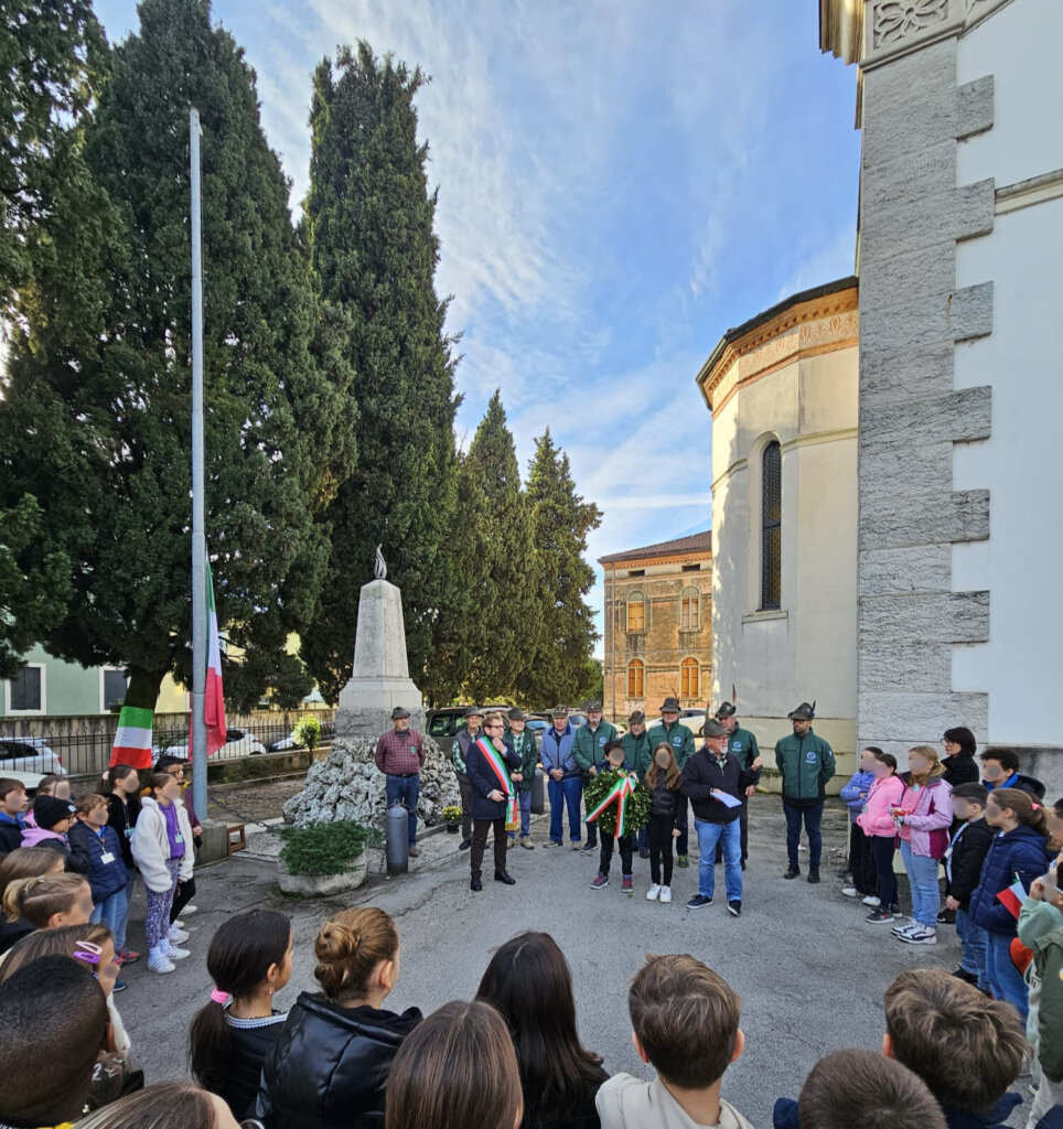 Dopo la cerimonia istituzionale tenuta ieri in piazza dei Signori in occasione del 4 novembre, si è svolto oggi un momento di riflessione sulla Festa dell’Unità nazionale e delle Forze armate con alcuni studenti della città. Il Gruppo Alpini Vincenzo Periz di Setteca’, Bertesina e Bertesinella ha organizzato infatti una breve cerimonia con gli alunni della scuola primaria Lioy, a cui ha partecipato il sindaco Giacomo Possamai. Davanti al monumento ai Caduti, nel sagrato della chiesa di Madonna della Pace, è stata depositata una corona d’alloro ed è stato issato il Tricolore.