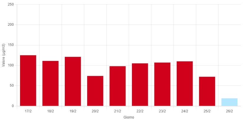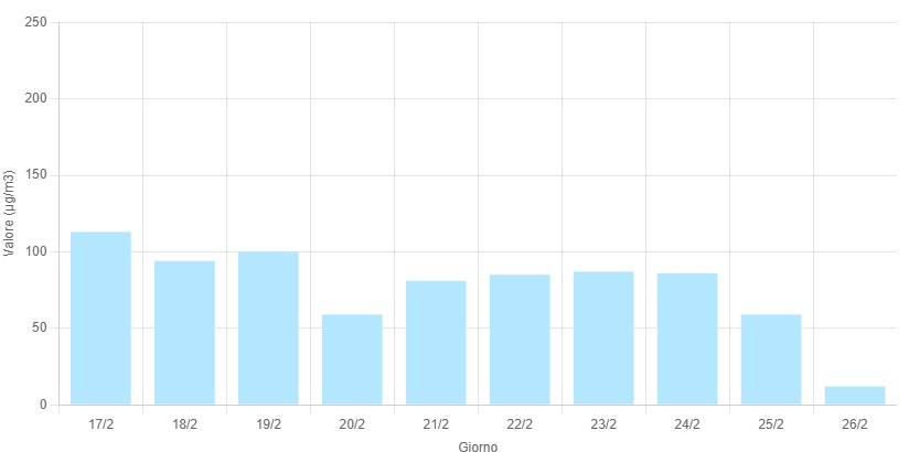 Nel grafico sotto l’andamento delle Pm10 a San Felice a Vicenza, con valori scesi ampiamente sotto il livello di guardia. Sotto, invece, le rilevazioni di Pm2.5 fatte dalla centralina Arpav dei Ferrovieri.
