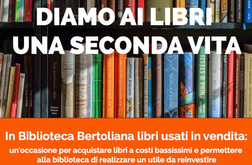 In Biblioteca Bertoliana, da oggi a martedì 15 maggio, libri usati in vendita a un prezzo simbolico: un’occasione per acquistare libri a costi bassissimi e permettere alla biblioteca di realizzare un utile da reinvestire. L’iniziativa “Diamo ai libri una seconda vita” si propone di valorizzare la risorsa di copie soprannumerarie di libri moderni della biblioteca offrendo loro un’altra occasione di lettura. Saranno messi in vendita libri per tutti, bambini ed adulti, di narrativa, letteratura, libri di argomento vicentino, enciclopedie, dizionari, cataloghi di mostre, opere di saggistica, rigorosamente selezionati e venduti ad un prezzo simbolico. Il ricavato della vendita servirà ad arricchire le collezioni della Bertoliana; verranno, infatti, acquistati e aggiornati libri e materiali multimediali utili sia per la sede storica di San Giacomo che per le sedi cittadine di Palazzo Costantini, Villa Tacchi, Anconetta, Villaggio del Sole, Laghetto, Riviera Berica. Il mercatino di svolgerà dal 2 al 7 maggio nella sede di Palazzo Costantini (contra’ Riale, 13), dall’8 al 15 maggio nella sede di Palazzo San Giacomo (contra’ Riale, 5) dalle 9 alle 18.