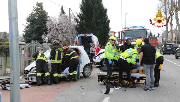 VICENZA – Incidente piuttosto grave oggi pomeriggio alle 14.30 lungo la strada Postumia tra Anconetta e Ospedaletto, tre auto coinvolte e una donna ferita. I pompieri hanno messo in sicurezza i mezzi e utilizzando divaricatori e cesoie idrauliche hanno estratto una giovane donna, rimasta incastrata all’interno dell’abitacolo di una Hyundai Atos. La ferita già assistita dal personale del 118, è stata stabilizzata e portata in ospedale. Illesa la conducente della Nissan Qashqai e l’autista della Volkswagen Touareq. La dinamica del sinistro al vaglio della polizia locale intervenuta. Le operazioni di soccorso sono terminate dopo circa un’ora.