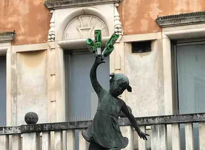 La bimba sollevata dal bambino innalza ora al cielo quattro bottiglie vuote di birra in una iconica esaltazione di una delle principali qualità dei veneti. L’installazione d’arte contemporanea non è passata inosservata (foto pubblicata da Fabio Nicoletti del Grottino su Facebook).