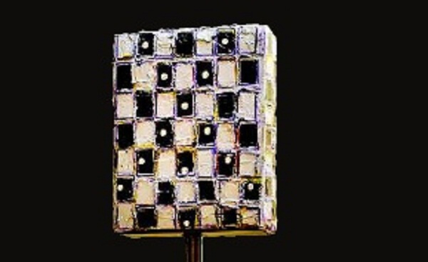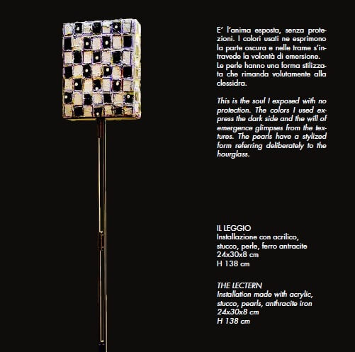 L’opera in questione è un’installazione creata nel 2016, lavorata con acrilico, stucco, perle, il cui chassis in ferro antracite è stato concepito e disegnato da Michela Rompato in collaborazione con l’architetto Ruggero Marzotto e forgiato artigianalmente. “Il Leggio rappresenta l’anima esposta, senza protezioni, nuda.” – spiega l’artista – “I colori usati, ne esprimono la parte oscura, mentre nelle trame, diverse su ognuna della facciate s’intravede la singola volontà di emersione. Le perle applicate hanno una forma stilizzata che rimanda volutamente alla clessidra”.