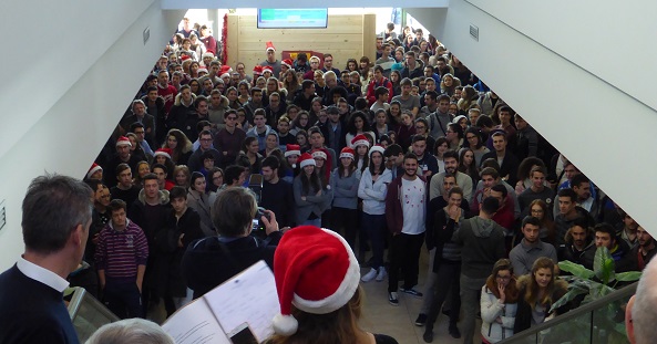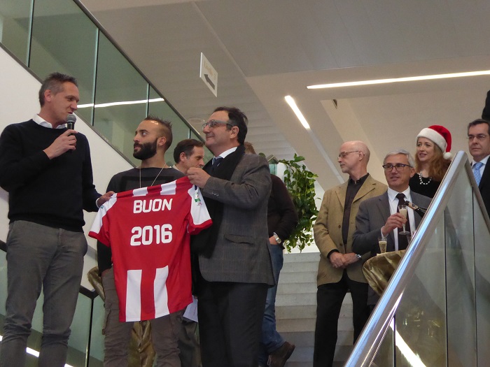 Una cerimonia festosa si è svolta stamattina nella sede universitaria di Viale Margherita a Vicenza. A fare i tradizionali auguri di Natale, assieme al presidente della Fondazione Studi Universitari di Vicenza, Silvio Fortuna e al Direttore, Carlo Terrin, erano presenti anche Luca Cielo, direttore generale di Cielo e Terra Vini, che ha gentilmente offerto lo spumante per il brindisi, i referenti dei tre Poli universitari a Vicenza (Ingegneria, Economia e Sicurezza Alimentare), Andrea Gazzoli, Direttore Generale del Vicenza Calcio e super ospite: Stefano Giacomelli, bomber del Vicenza Calcio. Continua infatti la proficua collaborazione fra la Fondazione Studi Universitari e il Club Biancorosso. La professoressa Paola Signori, docente di Marketing, ha presentato il “Contest fotografico 2015” rivolto agli studenti UNIVI che si combatterà a suon di foto e di “mi piace”sulla pagina Facebook dell’Università a Vicenza. In palio tre premi “social” sponsorizzati anche quest’anno dal Vicenza Calcio; primo premio: 2 abbonamenti gratis, secondo premio: una maglietta biancorossa personalizzata sul retro con la scritta “buon 2016”, terzo premio: un pallone. Altri 2 premi “della critica” per gli studenti in lizza: un bonus fotocopie offerto dalla ditta GBR Rossetto e un bonus consumazioni offerto dal Gruppo Argenta. Centinaia di studenti, moltissimi con i “berretti rossi”da Babbo Natale, 21 kg di panettone offerti dalla Dolciaria Loison, musica e clima di festa hanno animato l’iniziativa.