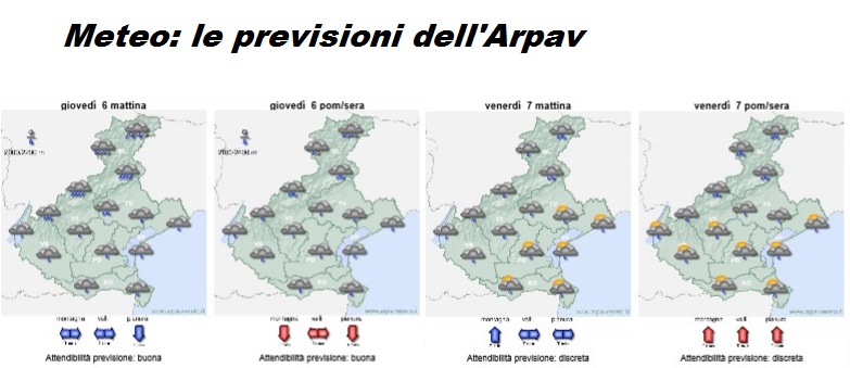 Domani: Possibili fenomeni più persistenti sui settori orientali del Veneto con quantitativi generalmente meno consistenti rispetto a mercoledì anche se localmente potranno risultare abbondanti sulle zone montane e pedemontane. Sul resto della regione precipitazioni in generale attenuazione e diradamento salvo possibili rovesci, a tratti anche assenti specie sui settori occidentali. Limite neve intorno a 2100-2300 m.