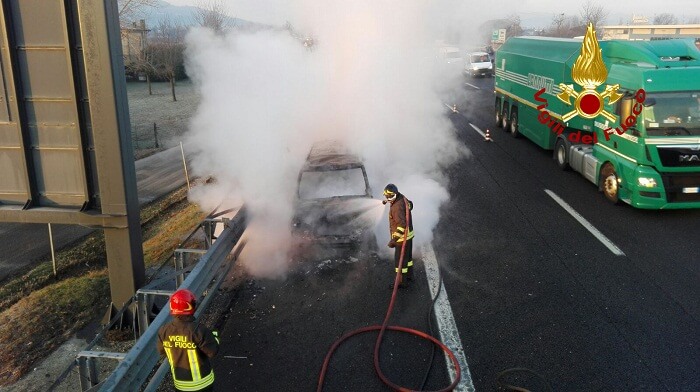Poco dopo le ore 8, i vigili del fuoco sono intervenuti lungo l’autostrada A4 per l’incendio di un’autovettura tra i caselli di Montecchio e Vicenza Ovest in direzione Venezia: illeso il conducente. I pompieri di Arzignano hanno spento l’incendio della Land Rover completamente avvolta dalle fiamme, mentre l’autista un uomo di Arcole era riuscito a mettersi in salvo dopo aver visto fuoriuscire del fumo dal cofano della vettura. Le operazioni di completo spegnimento dell’auto e la messa in sicurezza del luogo sono terminate dopo circa un’ora e mezza.
