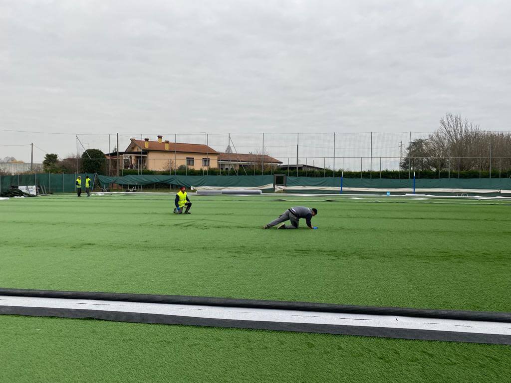 Sopralluogo del vicesindaco e assessore ai lavori pubblici e allo sport Matteo Celebron e dell’assessore al bilancio Marco Zocca questa mattina al campo da calcio di via Gagliardotti dove è in fase di completamento la posa del nuovo manto in erba sintetica.
