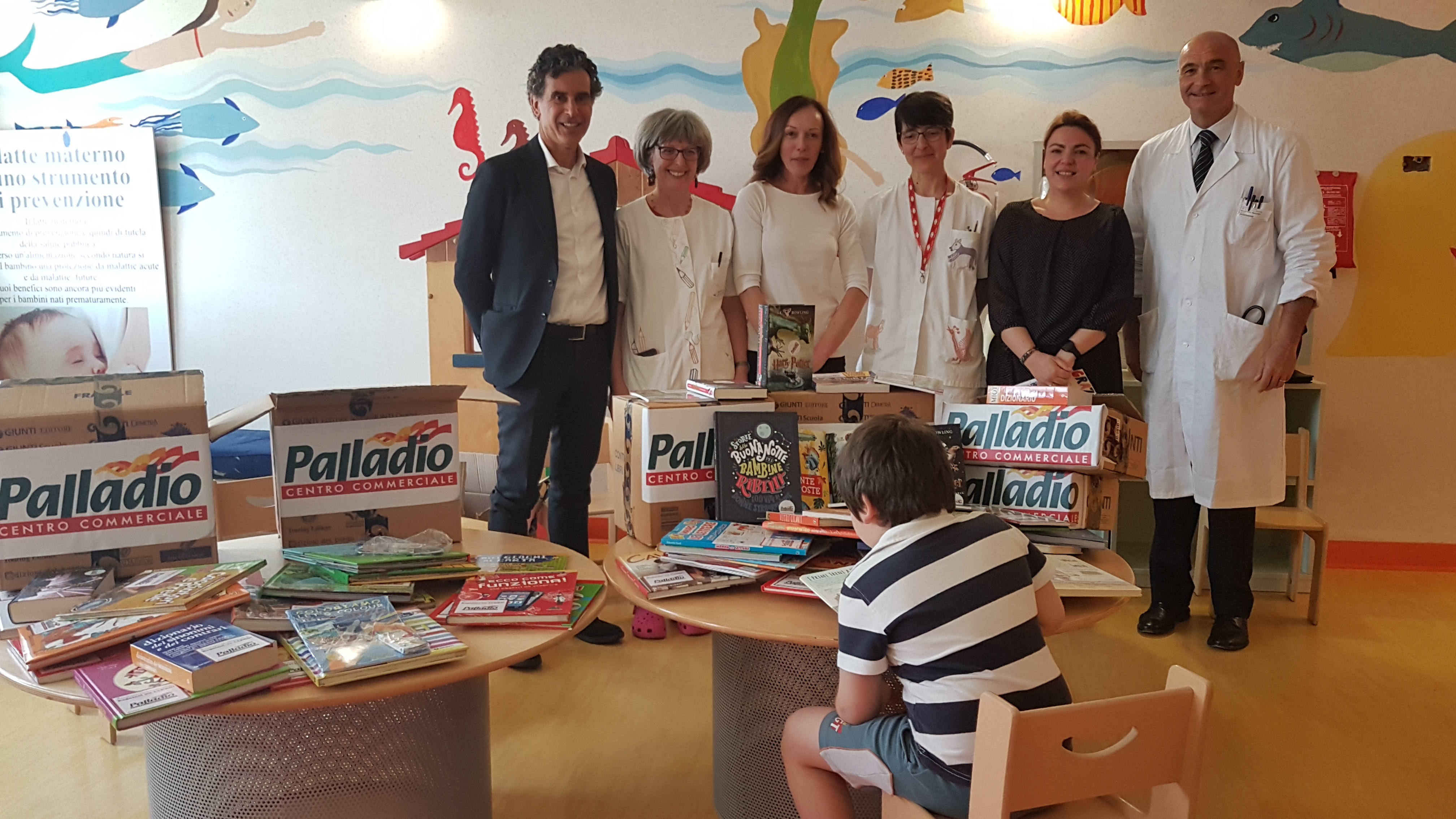 La biblioteca della Scuola in Ospedale del S. Bortolo si arricchisce di 116 nuovi libri, per tutti i gusti e tutte le età: da quelli per i pazienti in età pre-scolare a testi più impegnativi adatti agli adolescenti. Classici della narrativa, le saghe più amate degli ultimi anni – tra cui tutti i volumi di Harry Potter, naturalmente – ma anche testi divulgativi su vari argomenti. A donarli, il Centro Commerciale Palladio in collaborazione con la Libreria Giunti Al Punto che ogni anno promuove l’iniziativa “Aiutaci a crescere, regalaci un libro”, proponendo ai propri clienti di acquistare e donare un libro sia per arricchire le biblioteche di classe sia da destinare a bambini e adolescenti in ospedale. Un invito che il centro commerciale vicentino ha colto, scegliendo di destinare il ricavato della propria donazione alla Pediatria dell’ospedale cittadino. E proprio in Pediatria oggi è avvenuta la cerimonia di consegna dei volumi, che potranno essere utilizzati in vari modi: innanzitutto dagli insegnanti della Scuola in Ospedale, come strumento per l’accoglienza e per la didattica, ma anche per attività di animazione, prestiti in stanza e altre iniziative. «Ringrazio per questa importante donazione – sottolinea il dott. Massimo Bellettato, direttore dell’U.O.C. di Pediatria del S. Bortolo – che consentirà di rendere più piacevole e utile per i nostri pazienti il tempo trascorso in ospedale. Avranno così modo di imparare cose nuove, appassionarsi alla lettura, o ancora di scoprire nuovi autori e titoli che non conoscevano. È importante che i pazienti pediatrici, compatibilmente con le loro condizioni di salute, possano vivere il tempo trascorso in ospedale nel modo più normale e più costruttivo possibile e questa donazione sarà di grande aiuto».