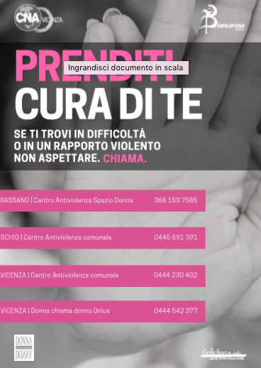 E’ iniziata la campagna di sensibilizzazione e informazione sociale “Prenditi cura di te” promossa dalla Cna berica in collaborazione con l’associazione Biancarosa Onlus e i centri antiviolenza di Vicenza, Schio e Bassano.