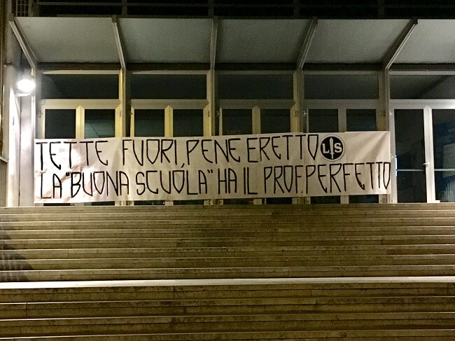 Nella notte di giovedì, i militanti di Lotta studentesca, organo giovanile di Forza Nuova, hanno appeso al di fuori dell’Istituto Rossi, uno striscione riportante la scritta: “Tette in fuori e pene eretto La “buona scuola ha un prof perfetto”.