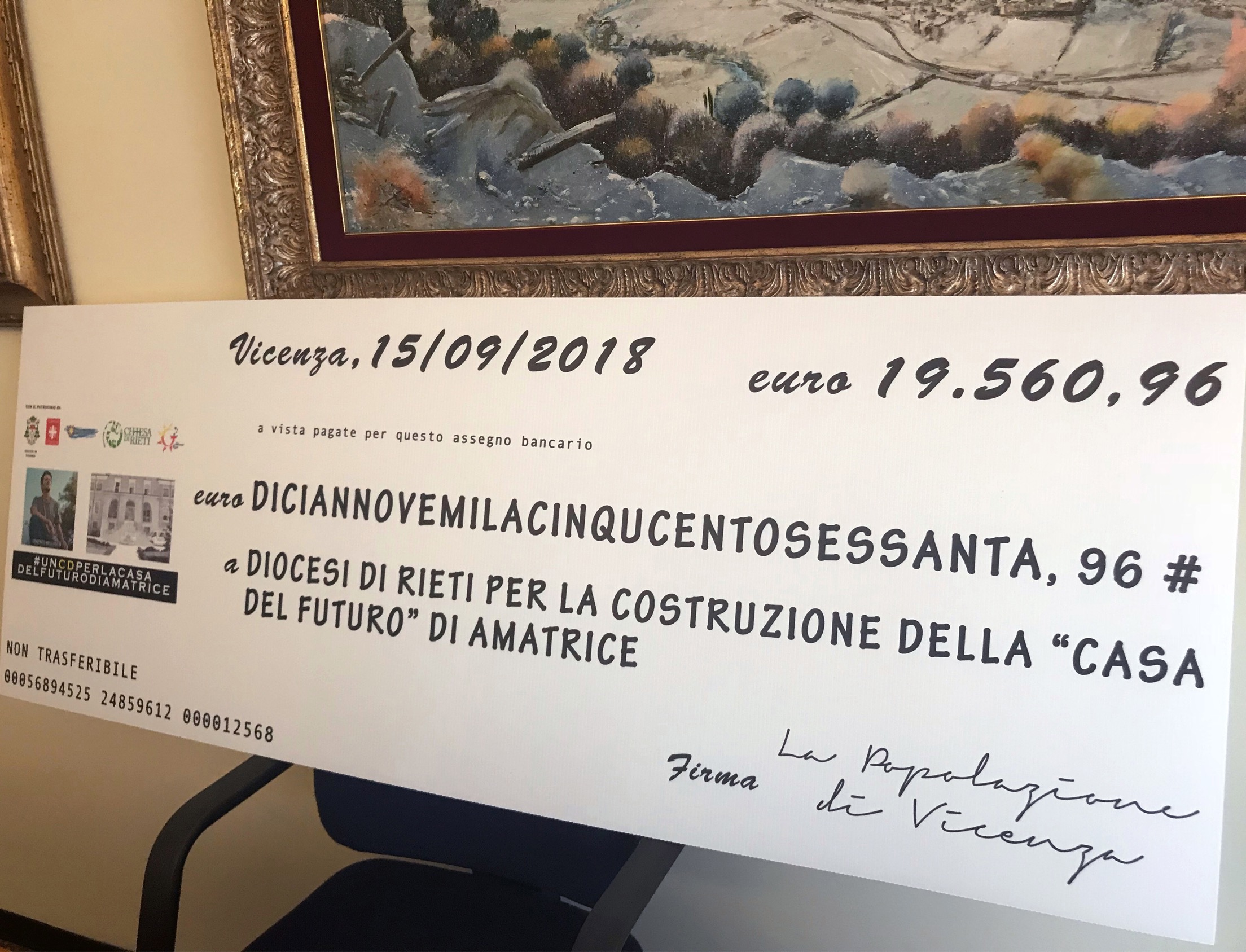 19.560,96 euro in viaggio da Vicenza ad Amatrice. A tanto ammonta l’importo raccolto e consegnato sabato 15 settembre scorso alla Diocesi di Rieti per la costruzione della Casa del Futuro, polo sociale e culturale di aggregazione ad Amatrice. A portare concretamente l’assegno a mons. Domenico Pompili, vescovo di Rieti, Lorenzo Belluscio, cantante e assicuratore vicentino, ideatore del progetto #unCDperlaCasadelFuturodiAmatrice, assieme alla fidanzata Alessia Miottello e don Enrico Pajarin, direttore della Caritas Diocesana Vicentina. Tutto ha origine nel luglio del 2016, quando Lorenzo Belluscio viene contattato dalla pastorale giovanile di Rieti per partecipare al concerto del Meeting dei Giovani, in programma a gennaio 2017. I piani vengono, però, sconvolti dal terremoto che colpisce le zone del centro Italia il 24 agosto 2016. Nonostante le tragiche conseguenze, mons. Pompili sceglie, con audacia, di portare avanti il Meeting dei Giovani, facendolo organizzare dai ragazzi di Amatrice proprio nella loro terra martoriata. L’organizzazione cambia completamente e il concerto di Lorenzo Belluscio viene annullato, ma il cantante decide di rimanere in contatto con il centro Italia per fare qualcosa di concreto. Viene così coinvolto nel progetto della Casa del Futuro.