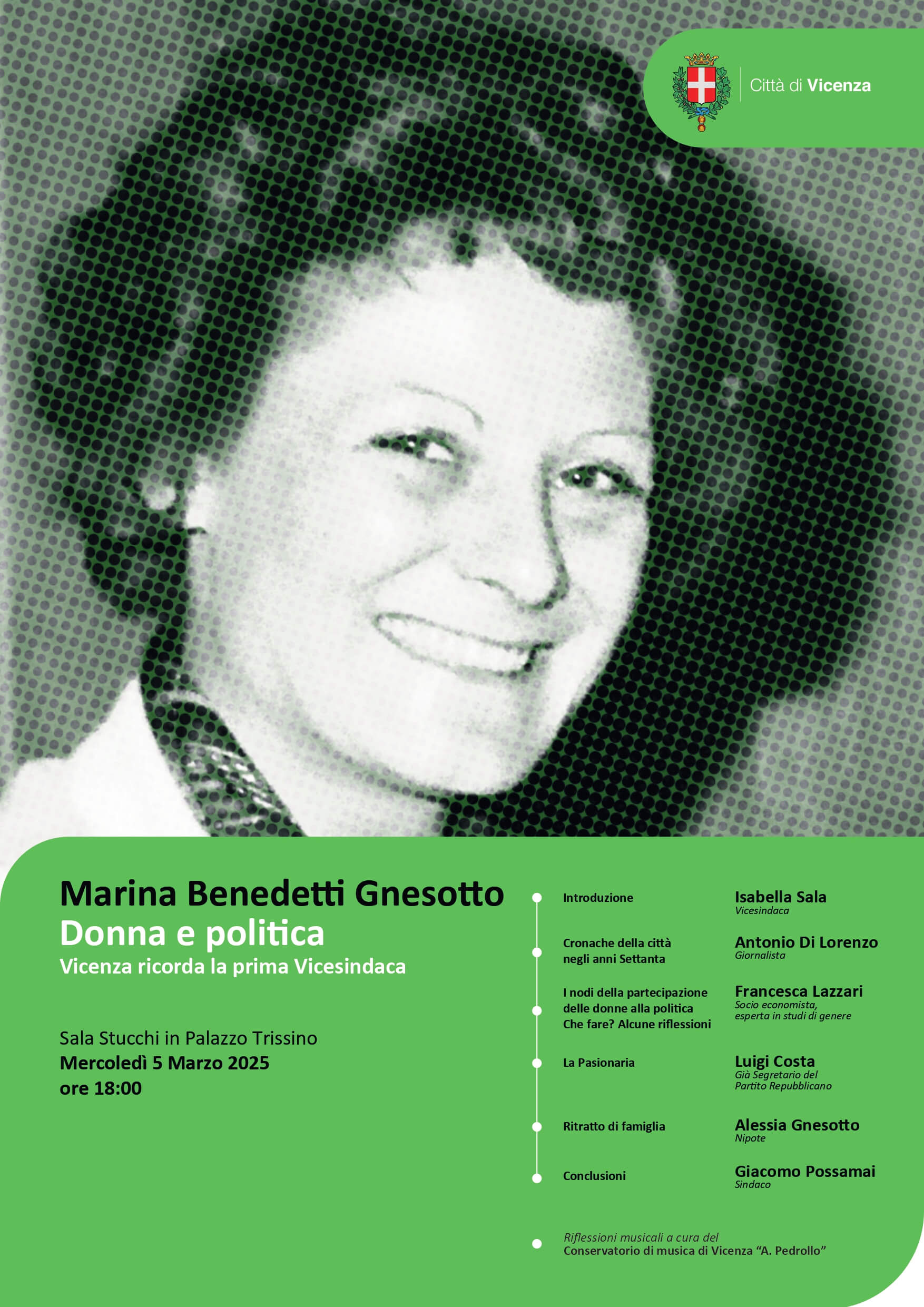 | Il 5 marzo alle 18 nella sala degli Stucchi di Palazzo Trissino si terrà l’incontro “Donna e politica. Vicenza ricorda la prima Vicesindaca Marina Benedetti Gnesotto”. L’appuntamento vedrà la partecipazione del sindaco Giacomo Possamai e della vicesindaca Isabella Sala.«Con orgoglio dedichiamo questo incontro alla prima vicesindaca donna di Vicenza – sottolinea il sindaco Giacomo Possamai -. Marina Benedetti Gnesotto è stata una pioniera e un esempio da seguire, anche per la nostra amministrazione che ha scelto di attribuire alle donne dei ruoli di assoluto rilievo, come quelli di vicesindaca, direttore generale, così come di segretario generale e tre assessori. Crediamo infatti non sia banale riconoscere il valore e la competenza delle figure femminili in una società in cui ancora troppo spesso si verificano discriminazioni di genere, nel lavoro così come nella vita privata».Con il Partito repubblicano italiano Marina Benedetti Gnesotto è stata eletta consigliera comunale nel 1975, mentre dal 1977 al 1978 ha ricoperto l’incarico di vicesindaca e assessora con delega a Decentramento, partecipazione e informazione.«Marina Benedetti Gnesotto, scomparsa lo scorso 20 dicembre, ricoprì l’incarico di prima vicesindaca della città, nella giunta guidata da Giovanni Chiesa. In un’epoca in cui le donne in politica erano poche, aprì una nuova strada grazie alla sua passione e competenza. Abbiamo ritenuto importante proporre un momento a lei dedicato inserito nel programma di eventi per la Giornata internazionale della donna dell’8 marzo. Marina è stata un esempio di passione profonda per la politica in senso alto e pieno, di forza e speranza nei diversi tempi della vita: per lei un’ammirazione e gratitudine profonda e vera», ricorda la vicesindaca Isabella Sala.All’incontro del 5 marzo interverranno il giornalista Antonio Di Lorenzo, giornalista per una cronaca della città negli anni Settanta; Francesca Lazzari, socio economista, esperta in studi di genere, già assessora alla cultura e all’urbanistica a Vicenza, per un approfondimento sulla partecipazione delle donne in politica. Il ritratto politico e personale di Marina Benedetti Gnesotto sarà affidato a Luigi Costa, già segretario del Partito Repubblicano e alla nipote Alessia Gnesotto.L’evento vedrà alcune riflessioni musicali a cura del Conservatorio di musica di Vicenza “A. Pedrollo” con Giacomo Sbalchiero al clarinetto e Martina Filippi e Jacopo Parolo in un duo di fisarmonica.Ingresso libero fino a esaurimento posti disponibili. |