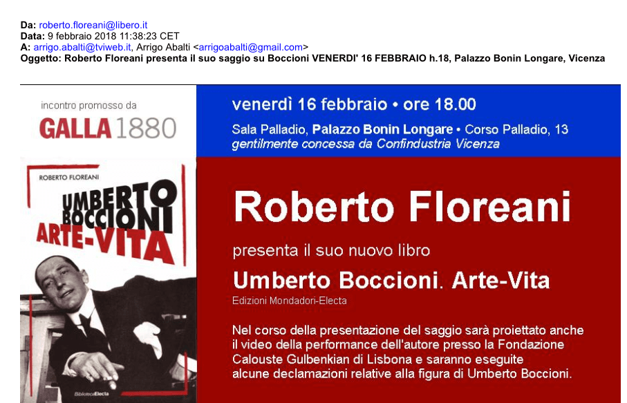 Venerdì 16 febbraio verrà presentato a Palazzo Bonin Longare a Vicenza il volume “Umberto Boccioni. Arte-Vita” (Mondadori-Electa), primo saggio su Boccioni scritto da un altro artista, Roberto Floreani. Umberto Boccioni ha elaborato le ragioni di un nuovo modo di concepire l’arte e il mondo, facendo coincidere la natura dell’uomo con la sua espressione artistica. Ha affermato così l’assoluta novità dell’arte-vita, che tanto rilievo avrà nelle personalità di artisti quali Andy Warhol, Carmelo Bene e Mario Schifano, e nel movimento dell’arte povera. Ricco di spunti e riferimenti storiografici, questo volume ne ristabilisce la corretta data della morte, dettaglia la distruzione dolosa di gran parte delle sue sculture, analizza gli aspetti della sua complessa personalità e i rapporti conflittuali con gli altri artisti, la madre, le amanti.