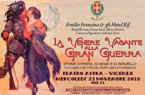 In un racconto che alcune ne utilizza e che altre, dimenticate o sostanzialmente censurate, ne recupera, la conferenza spettacolo “La venere vagante alla Gran Guerra” di Emilio Franzina e degli Hotel Rif, in programma mercoledì 23 novembre alle 21 al Teatro Astra, ripercorre senza reticenze aspetti e momenti del periodo bellico da questo preciso punto di vista: esso incluse, infatti, sia gli slanci meglio noti dell’amore materno e dell’amore filiale dei giovani soldati o le passioni amorose di mogli e di mariti (e fidanzati) al fronte, e sia le intuibili pulsioni sessuali di migliaia e migliaia di militari, combattenti o territoriali, confinate di solito, ieri nei fatti ed oggi nel ricordo, in una zona d’ombra pudica e fuorviante.