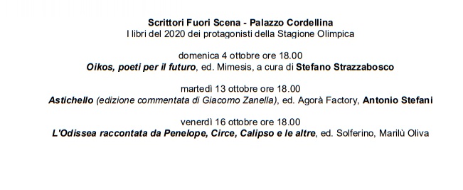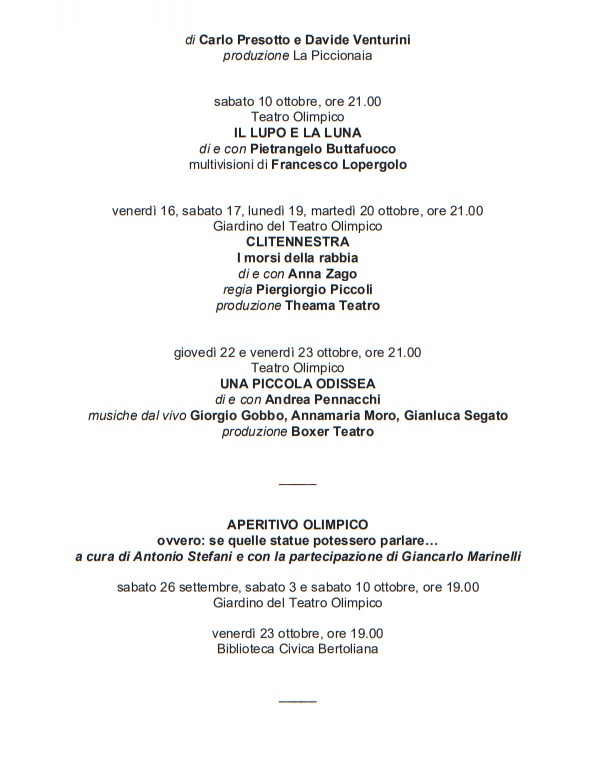 “Sono felice e orgoglioso di come il pubblico ha accolto l’invito a partecipare a questo ritorno a casa: con gioia, entusiasmo e generosità – prosegue il Direttore Artistico Giancarlo Marinelli -. Perché il teatro è questo: la scienza esatta della civiltà che si autorappresenta e si definisce. Fermare il teatro significa bloccare la civiltà. Se poi il teatro è l’Olimpico di Vicenza, il teatro al coperto più antico e più bello del mondo. Per questo, ripartire da qui significa dire al mondo non solo che Vicenza, il Veneto, l’Italia non si fermano. Perché è il mondo che lo dice a se stesso”. Ed è una scelta ardua, quella di inaugurare il Ciclo dei Classici con La signora Dalloway in versione teatrale: il Direttore Artistico e regista Marinelli ha scelto infatti un romanzo difficilissimo da rappresentare, per l’uso estremo del monologo interiore e del dialogo esasperatamente intimo, in cui i personaggi fanno emergere la loro verità quando solo parlano con se stessi; ma il classico novecentesco per un “teatro impossibile” assume significati molto pregnanti, con straordinarie consonanze alla nostra situazione. La storia è di quella giornata particolare, un mercoledì di giugno 2 del 1923, in cui Clarissa Dalloway, dopo mesi di esilio forzato dal mondo, esce nelle strade di Londra per comprare dei fiori; quella sera, nella sua casa borghese ed elegantissima, si celebra il ritorno alla vita di un pezzo di società e forse di un intero continente finalmente libero dal massacro della guerra e della febbre spagnola. Ma Clarissa e gli altri (personaggi in scena rigorosamente distanziati, come prevede la scrittura drammaturgica e il senso del romanzo) devono liberarsi dai loro tormenti per essere pronti alla nuova vita in modo più puro e autentico. Lo spettacolo sarà in scena venerdì 25, sabato 26 e domenica 27 settembre, e ancora giovedì 1, venerdì 2 e sabato 3 ottobre alle 21.00. (biglietti disponibili su www.classiciolimpicovicenza.it). Gli altri titoli del programma dei Classici sono Elena e Penelope, di e con Giorgio Montefoschi e con Romina Mondello, una lectio olimpica, in prima nazionale, di uno degli autori più celebrati della narrativa contemporanea, critico letterario e traduttore, in programma “fuorisede” (a Palazzo Cordellina della Biblioteca civica Bertoliana, a Vicenza) martedì 29 settembre alle 18.00, a raccontare la personalissima visione del “ritorno a casa” del romanziere, attraverso le voci di donna di due eroine, tra i miti fondativi della civiltà occidentale, interpretate e viste con uno sguardo anticonvenzionale. E ancora, un potente monologo al femminile, è previsto per il terzo appuntamento con Ecuba e le streghe. Castracagna, la strega del Po, di e con Ivana Monti, in scena martedì 29 settembre alle 21.00, una riscrittura site specific per il Teatro Olimpico. E un’altra intensa interpretazione al femminile, un omaggio a Shakespeare, è quella rappresentata da Noi. Dialoghi shakespeariani di e con Anna Galiena – che dello spettacolo firma anche la traduzione e la drammaturgia – in scena mercoledì 30 settembre alle 21.00: amore, odio, potere, gelosia, lussuria e tutte le passioni cantate dal Bardo, sono espressione dell’ambivalenza umana, per esprimere il doppio del teatro e della vita e per segnare simbolicamente il passaggio dal teatro classico a quello elisabettiano. Dedicato alle famiglie e ai più piccoli è il quinto titolo del Ciclo dei Classici, ancora una prima nazionale, con Palladio magico di Carlo Presotto (che è anche l’interprete dell’originale messa in scena) e Davide Venturini, una nuova produzione de La Piccionaia, programmata nelle domeniche di ottobre, il 4, l’11 e il 18 alle 17.30 nel giardino dell’Olimpico. Il lupo e la luna, di e con Pietrangelo Buttafuoco, sarà invece una ripresa teatrale del “cuntu” che lo scrittore e giornalista ha dato alle stampe nel 2011, una prima assoluta a teatro, accompagnata dalle videoproiezioni di Francesco Lopergolo, in programma sabato 10 ottobre alle 21.00: il giovane Scipione Cicalazadè, comandante degli eserciti Ottomani di terra e di mare, è sempre accompagnato da un lupo che ulula la sua passione per la sua dama, ma è anche la voce dell’eroe che grida la sua rabbia, il tradimento e l’utopia. Un mito rivisitato in modo rivoluzionario, sarà al centro del penultimo titolo del programma, Clitennestra. I morsi della rabbia di e con Anna Zago, una nuova produzione Theama Teatro, realizzata con la consulenza artistica e regia di Piergiorgio Piccoli; la pièce, dedicata all’eroina che incarna l’infamia femminile, verrà rappresentata, nel giardino del Teatro Olimpico venerdì 16 e sabato 17, lunedì 19 e martedì 20 ottobre alle 21.00. A chiudere il 73° Ciclo dei Classici, ancora una prima nazionale, Una Piccola Odissea di e con Andrea Pennacchi, con le musiche di Giorgio Gobbo, eseguite dal vivo dall’autore (chitarra e voce), da Annamaria Moro (violoncello) e da Gianluca Segato (lap steel guitar), in programma giovedì 22 e venerdì 23 ottobre alle 21.00, un lavoro che celebra il ritorno a casa dell’eroe errante per eccellenza della storia del mito, ma anche un personalissimo ritorno dell’autore teatrale veneto alla sua infanzia. 3 Nostos dunque per chiudere il viaggio, che è nostalgia, un vagare alla ricerca, ri-cercare qualcosa che sembra nuovo ma che in verità è stato perduto. Perché ogni viaggio è un viaggio a ritroso e ogni viaggio è un ritorno a casa. Ed è sicuramente un ritorno all’Olimpico. I posti per il pubblico e gli ospiti saranno ridotti rispetto alla capienza totale del Teatro Olimpico, per le normative di contenimento della pandemia, ma raddoppiati rispetto alle previsioni iniziali: diventano 210 in base alle linee guida del Dpcm del luglio scorso e alle disposizioni della Regione del Veneto sulla distanza interpersonale; l’accesso all’interno del Teatro sarà consentito 45 minuti prima dell’inizio dello sp