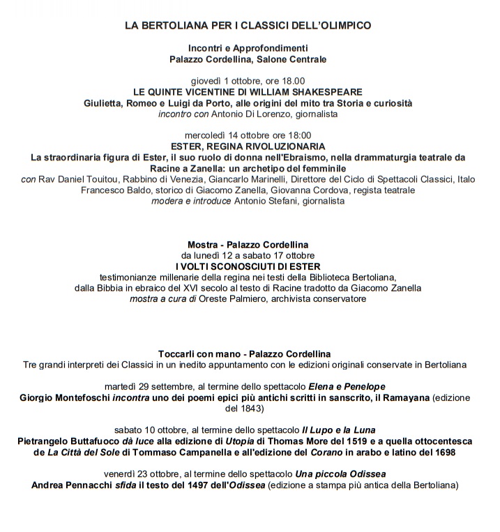 La quotidianità, per noi vicentini ma anche per noi abitanti di questo mondo che abbiamo costruito su una cultura antica che viene dalla Grecia e dal Mediterraneo, è fatta anche di teatro, musica, arte e di tutto ciò che, nel suo insieme, forma il lascito del pensiero classico, quello stesso che, unico, oggi noi possiamo leggere e rileggere per guardare al futuro con positività”.