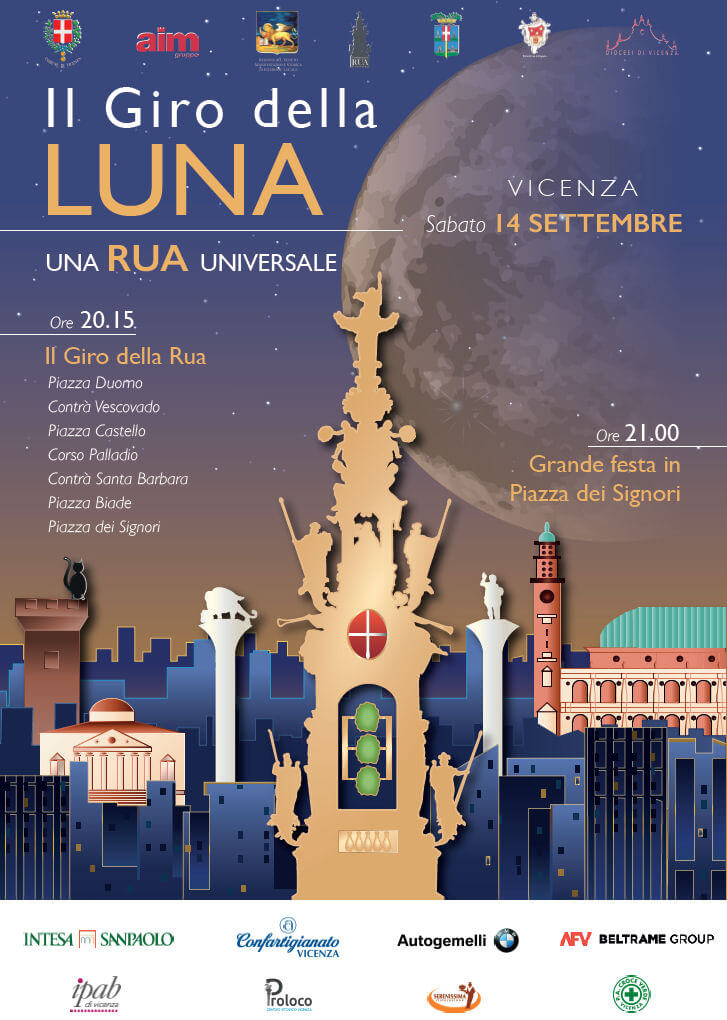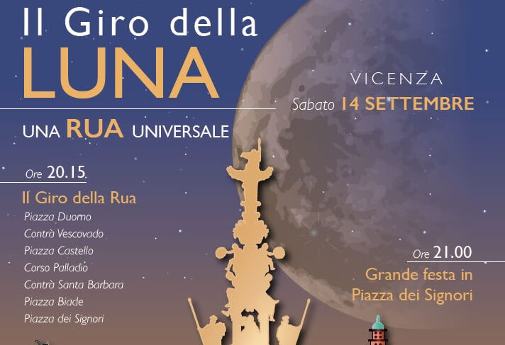 Per celebrare i 50 anni dallo sbarco dell’uomo sulla luna, Comune di Vicenza e Comitato per la Rua Vicenza, organizzatori della festa, hanno voluto celebrare la ricorrenza anche nel titolo della manifestazione che, per l’occasione diviene “Il Giro della Luna – una Rua universale”. A richiamare l’anniversario, anche una grande luna che illumina la Rua stilizzata del nuovo manifesto, realizzato quest’anno da Minja Diokic, studentessa ventenne dell’Accademia di Belle Arti di Verona risultata vincitrice del concorso bandito per la realizzazione della grafica dell’edizione 2019 della manifestazione.Un tema di sicura suggestione, perché la luna, nei suoi valori materiali, simbolici ed evocativi, è un simbolo trasversale alle culture e alle civilizzazioni umane. Per questo Vicenza e il Giro della Rua potranno diventare palcoscenico di una fiaba inventata per l’occasione, e che simbolicamente celebri la vicenda dei “500 anni di quando i vicentini conquistarono la luna”.La fiaba, come il mito, hanno la capacità di reinterpretare elementi della realtà, o persone e fatti realmente accaduti, visti con l’occhio della fantasia. E il Giro della Rua, con il suo spettacolo di suoni e luci, è un momento in cui migliaia di persone vogliono darsi appuntamento per sognare, per immergersi in una “irrealtà” che possa donare un sorriso, o un momento di riflessione. Il Rinascimento, momento iconico della Vicenza più conosciuta, è un ampio momento storico dove il carattere scientifico andava di pari passo con la magia, con le scienze occulte, con la voglia di evadere dalle conquiste di quel momento. Ma fu anche momento di relativo benessere, di ottimismo. Dunque, il Giro della Rua del 2019 celebrerà una sua personale conquista della Luna, di quella volta che i vicentini tentarono l’impresa.