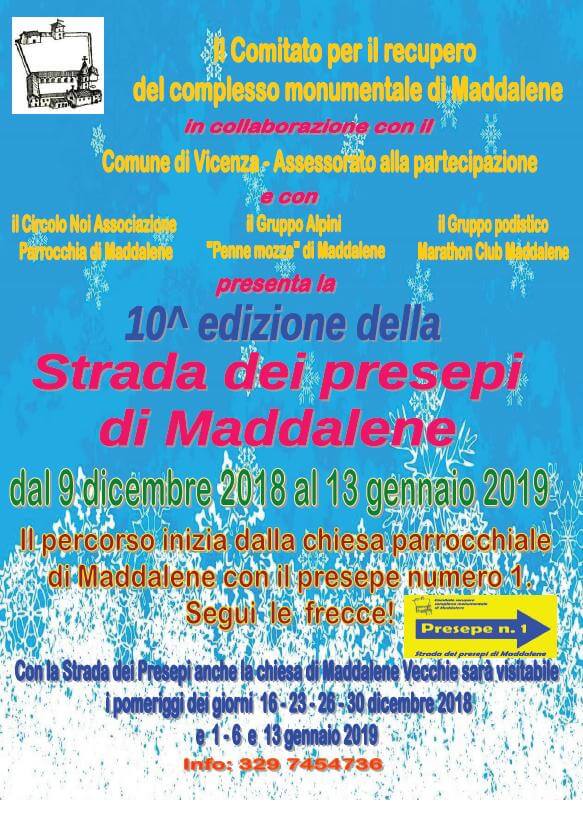 Il Comitato per il recupero del complesso monumentale di Maddalene comunica che domenica 9 dicembre 2018 alle ore 15, avverrà l’inaugurazione della decima edizione della manifestazione denominata “Strada dei presepi di Maddalene”, rassegna di varie rappresentazioni della Natività esposte lungo le vie del quartiere di Maddalene e realizzate da vari cittadini.
