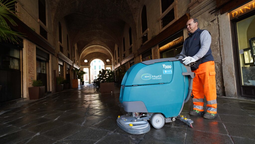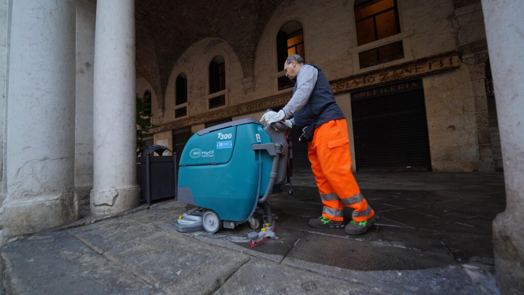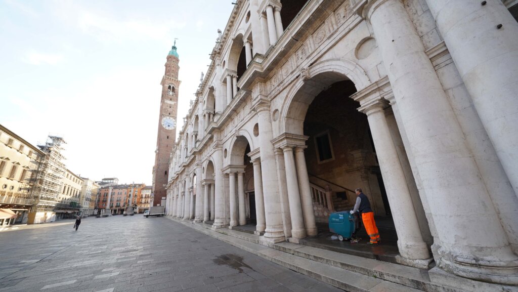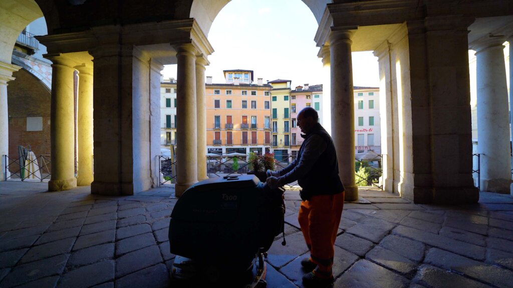 La nuova lavasciuga viene impiegata nel corso della settimana per la pulizia delle aree storiche di maggior celebrità e delicatezza, come gli androni della Basilica palladiana trattati tre volte alla settimana, e i portici di corso Palladio negli altri giorni.
