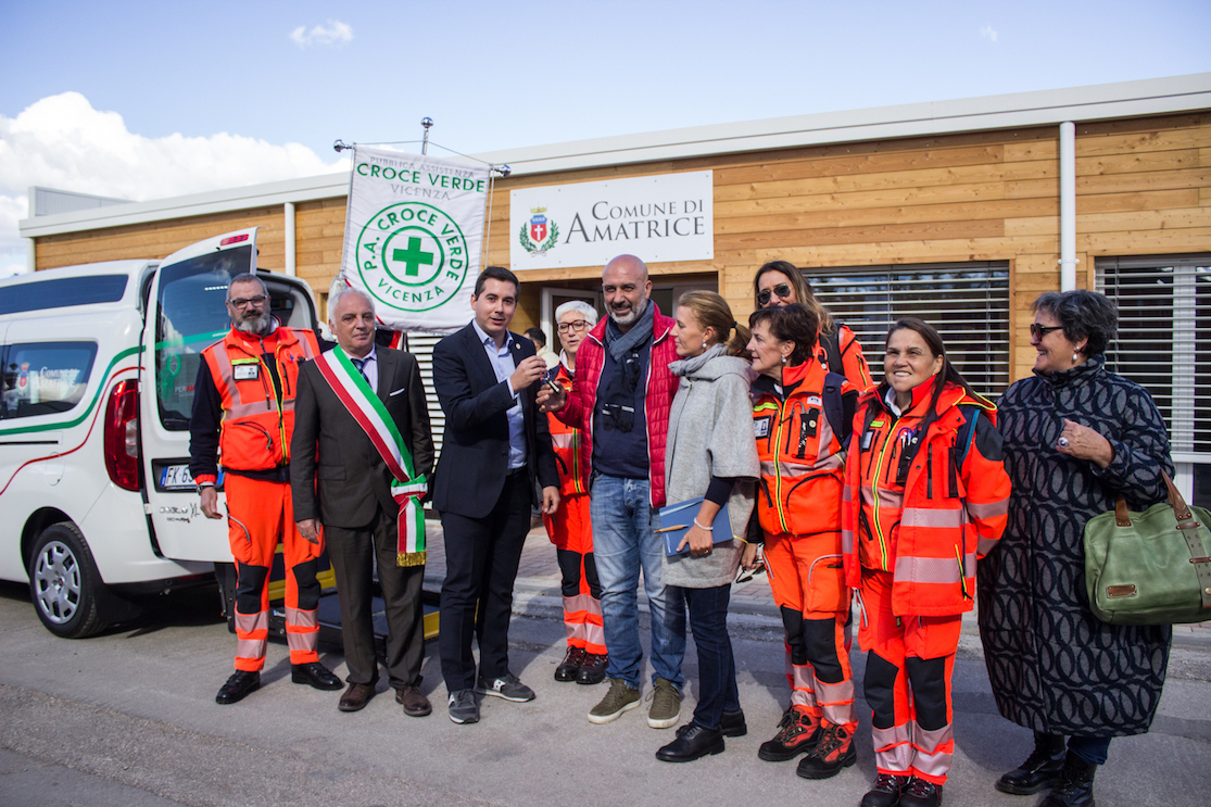 Nei giorni scorsi, a distanza di 14 mesi esatti dal terribile sisma che ha devastato il centro Italia, Croce Verde Vicenza insieme ad un gruppo di partner ha donato un mezzo per il trasporto di anziani e disabili a servizio del Comune di Amatrice e delle frazioni contermini. Croce Verde Vicenza è giunta fino ad Amatrice con il Fiat Doblò in regalo, con un gruppo di volontari dell’associazione accompagnati dal Presidente Sebastian Nicolai, la consigliere Alice Borgo e l’organizzatrice del progetto Roberta Vigolo. Alla delegazione hanno preso parte il consigliere comunale di Vicenza Valter Bettiato Fava, Isidoro Maccagnan per le cantine Bellaguardia, Alberto Maccagnan a rappresentanza della tifoseria calcistica vicentina, Stefano Meggiolaro per Cantine Vitevis, Andreina Bresolin per Effa imballaggi. Uno spaccato delle più di 60 aziende che hanno partecipato al progetto e delle decine di privati cittadini che hanno voluto offrire il proprio contributo. All’arrivo è stato il sindaco di Amatrice Sergio Pirozzi ad accogliere la delegazione ringraziando il volontariato italiano: “il volontariato è ciò che permette alle nostre terre di risorgere. Vicenza è una città lontana ma grazie al vostro sforzo e al vostro contributo fa sentire il suo calore non solo a me e all’amministrazione ma a tutti quei cittadini che potremo aiutare con il mezzo che ci state donando”, “Vi anticipo che già domani il mezzo sarà assicurato e quindi prenderà a circolare” Conclude Pirozzi manifestando sincera gratitudine. “Croce Verde Vicenza ha dato voce alle decine di persone che volevano portare un aiuto concreto ai territori terremotati. Un ringraziamento speciale a Roberta, Fausto e il gruppo WitMatrix che hanno curato l’organizzazione dell’iniziativa” spiega Nicolai “senza dimenticare tutte le aziende e i privati cittadini che hanno contribuito”. Il consigliere Valter Bettiato Fava ha portato i saluti del sindaco Achille Variati “la forza del volontariato vicentino ha permesso di raggiungere questo risultato di cui la città è orgogliosa. È bello avere la consapevolezza che in questo mezzo a supporto della comunità locale batte un cuore vicentino grazie a tutti coloro che hanno creduto in questo progetto”. Il progetto, oltre al patrocinio del Comune di Vicenza ha ricevuto il supporto dei comuni di Quinto Vicentino, Caldogno e Sovizzo. Il mezzo donato è un Doblò di ultima generazione con tetto rialzato, è dotato di ogni optional; la dotazione è completata da un sollevatore a doppio braccio elettrico con pedana compatto con l’obiettivo di massimizzare la visibilità all’interno del mezzo e lo spazio a disposizione per le persone trasportate. Il veicolo, la cui livrea è stata curata dal designer Franco Molon, socio di Croce Verde Vicenza, è semplice e sobria: esalta il senso di appartenenza alla nostra nazione, l’Italia. Dei nastri tricolore si librano nelle fiancate laterali culminando sul cofano nel grande cuore dove compaiono i nomi di tutti i sostenitori dell’iniziativa dove campeggia la frase “per un cuore che batte al centro” slogan particolarmente apprezzato dal sindaco di Amatrice Pirozzi. Sul mezzo compaiono inoltre i loghi dei principali partner dell’iniziativa: Comune di Vicenza, Italian Exibition Group, Vitevis, Effa, Witmatrix e Radio Vicenza, media partner dell’evento del primo aprile 2017. Il valore del mezzo, fornito da Rasotto group e allestito da Olmedo SPA, azienda leader nella preparazione di mezzi speciali, è superiore ai 30.000 euro.