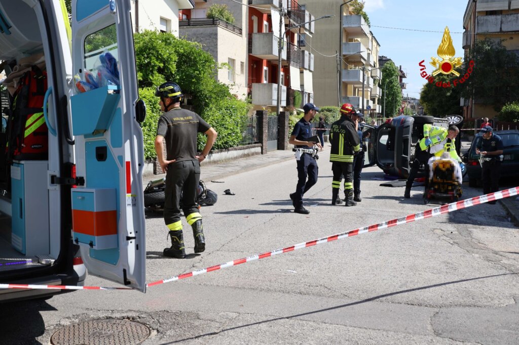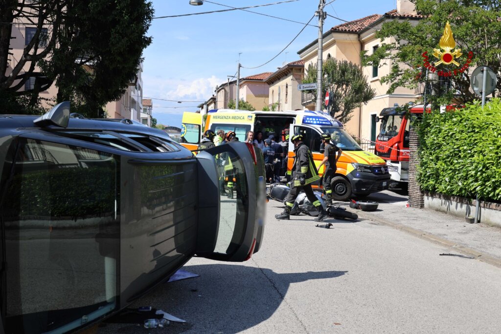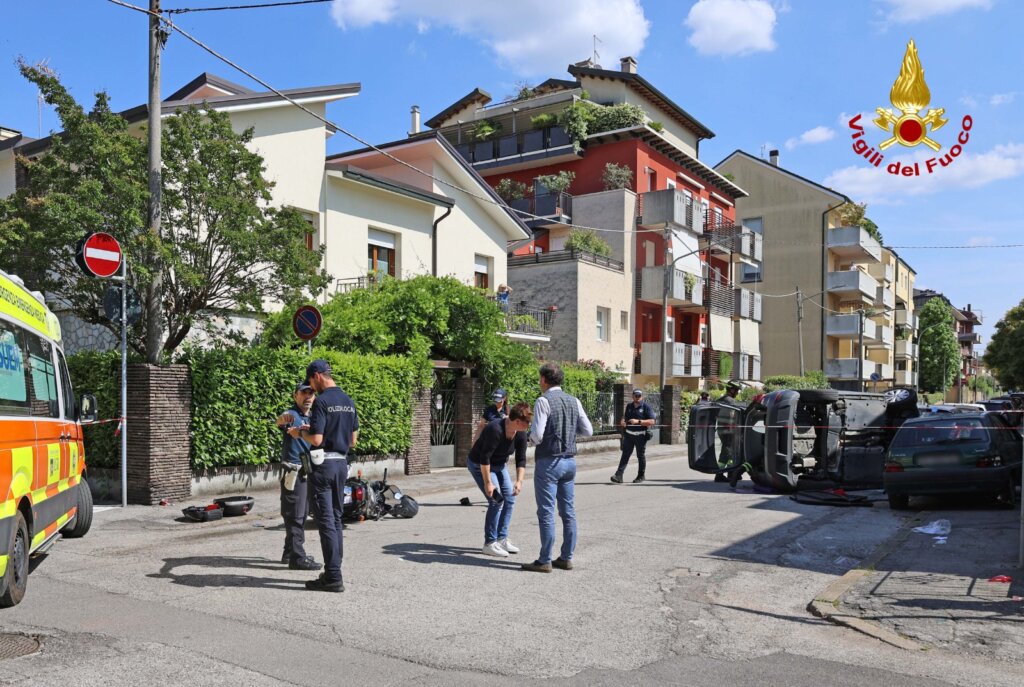 Poco dopo le 15:30, di lunedì 27 maggio, i vigili del fuoco sono intervenuti in Via Cimone a Vicenza per un incidente tra una moto e un’auto finita rovesciata su un fianco: feriti i due conducenti. Coinvolta una terza auto parcheggiata lungo la strada. I vigili del fuoco hanno messo in sicurezza i mezzi e coadiuvato i soccorsi sanitari del centauro e della donna venuta fuori per il portellone posteriore dell’auto. I due feriti sono stati assistiti dal personale sanitario e trasferiti in ambulanza in ospedale. La polizia locale ha chiuso la strada ed eseguito i rilievi del sinistro. Le operazioni di soccorso dei vigili del fuoco sono terminate dopo circa un’ora.