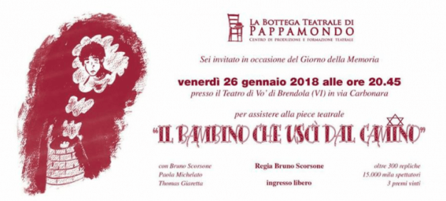 “…ero un bambino ebreo in quella primavera del 42 …Si viveva …no, non si viveva! Si rimaneva aggrappati alla vita come un brandello di stoffa appeso al vento!” Questo è l’inizio de IL BAMBINO CHE USCI’ DAL CAMINO, un viaggio nell’anima di tutte quelle persone, a cui sono stati tolti i diritti umani. Dal 2003 con oltre 300 repliche la Bottega Teatrale del Pappamondo di Bruno Scorsone ha portato a teatro oltre 15000 mila ragazzi, vincendo anche 2 premi nazionali ed 1 europeo per la ricerca storica, la regia e la recitazione, in quanto prima compagnia teatrale a portare in teatro “il giorno della memoria”. Venerdì sera alle ore 20.45 la piece teatrale verrà presentata presso il Teatro di Vo’ di Brendola, con Bruno Scorsone, Paola Michelato e Thomas Giaretta.