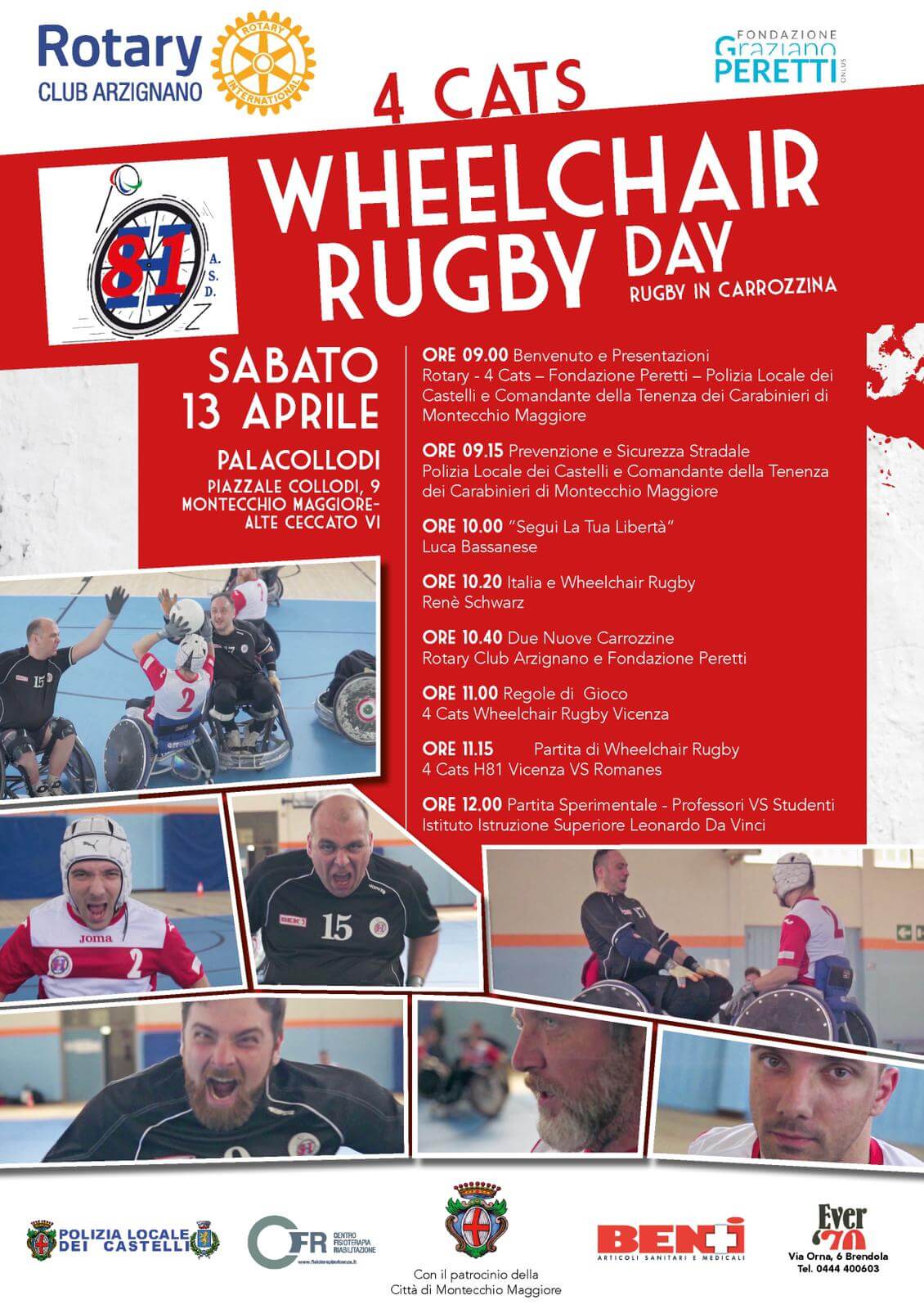 Montecchio Maggiore città per lo sport senza barriere. Sabato 13 aprile al Palacollodi in Piazzale Collodi andrà in scena il “Wheelchair rugby day”, evento dedicato al rugby in carrozzina promosso da Rotary Club Arzignano, Fondazione Graziano Peretti e dalla squadra di rugby in carrozzina “H81-4 Cats” dell’A.S.D. H81, con il patrocinio della Città di Montecchio Maggiore.