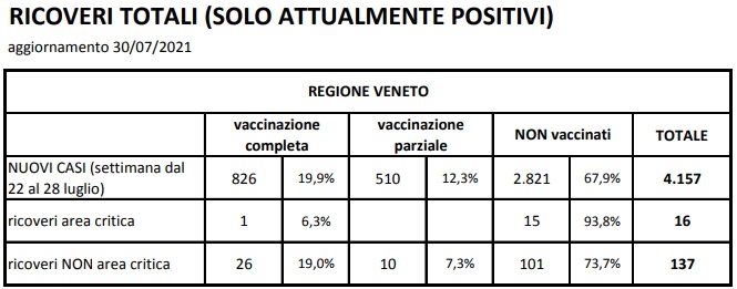 Dal 22 al 28 luglio: i casi sono stati 4157 casi di positività. Non vaccinati 2821. vaccinati parziali 510, vaccinati completi 825.