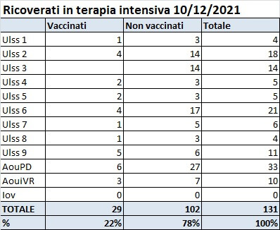 “I dati di oggi – fa notare Zaia – ci dicono che, su 131 ricoverati in terapia intensiva, il 78% è composto da pazienti non vaccinati e il 22% da vaccinati. Ipotizzando che l’intera popolazione fosse vaccinata – aggiunge – avremo solo 22 ricoverati in terapia intensiva, il che, in una ipotetica distribuzione provinciale significherebbe circa 3 per ogni provincia”.