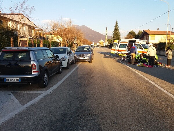 Grave incidente stamane a Zanè. Alle 08.20 circa a Zanè in Via S. Rosa, L. B. donna di anni 52 residente a Schio alla guida del veicolo Lancia Y, stava circolando in direzione di Thiene quando, per cause in corso di accertamento, anche accecata dal sole radente, ha investito un ciclista G. R. di anni 81 residente a Zanè che circolava in prossimità della mezzeria della carreggiata. A causa dell’urto l’anziano ha sbattuto rovinosamente la testa, mentre la conducente dell’auto, cercando di evitare l’urto finiva la sua marcia contro due auto in sosta.