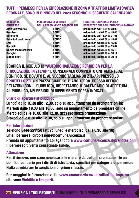 Da metà gennaio i circa 2700 possessori di permessi di transito in ZTL, la cui validità nei mesi scorsi è stata prorogata fino al 31 dicembre 2019, saranno chiamati a recarsi a “scaglioni” allo sportello ZTL di piazza Biade non più per rinnovare il documento, ma per presentare un’autodichiarazione di permanenza dei requisiti.