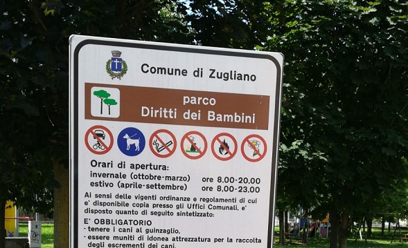 A seguito di reiterate segnalazioni da parte della cittadinanza che lamentava che il parco di via Marconi di Zugliano fosse spesso “ostaggio” del comportamento irriguardoso da parte di giovani, l’Amministrazione di Zugliano apponeva nell’area verde una chiara cartellonistica per evidenziare ai fruitori del parco i comportamenti vietati, al fine di tentare di prevenire infrazioni e di garantire “I DIRITTI DEI BAMBINI”.